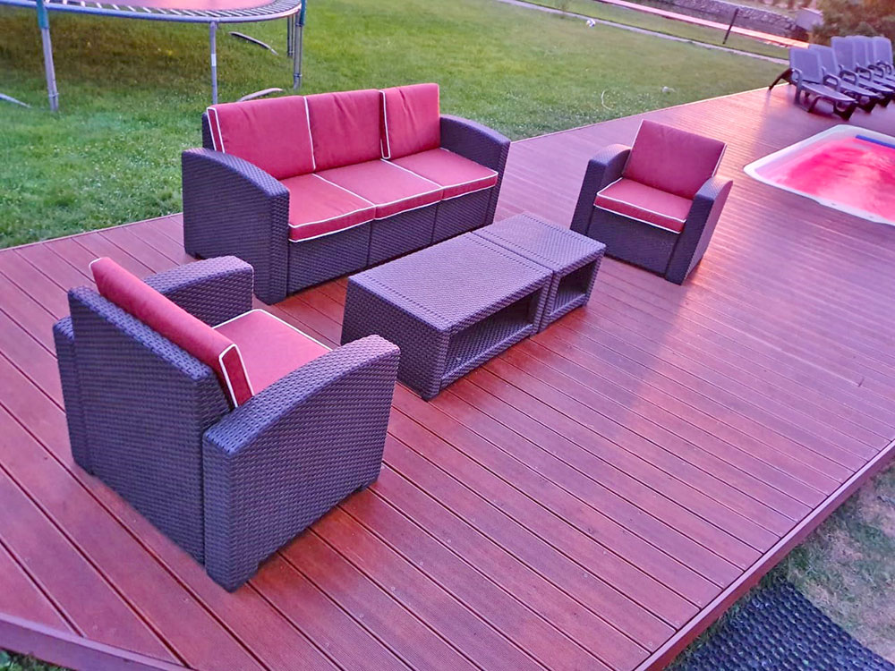 Мебель-мебелью, но нам пришлось еще и подумать о формировании самого пространства для отдыха. И т.к. на территории предполагалось разместить еще и бассейн, то нам потребовалась доска с максимальной устойчивостью к влаге, доска которая не боится высокой влажности и частого контакта с водой. И для этих целей нам подошла доска Holzhof, с отличными свойствами и имитацией настоящего дерева.